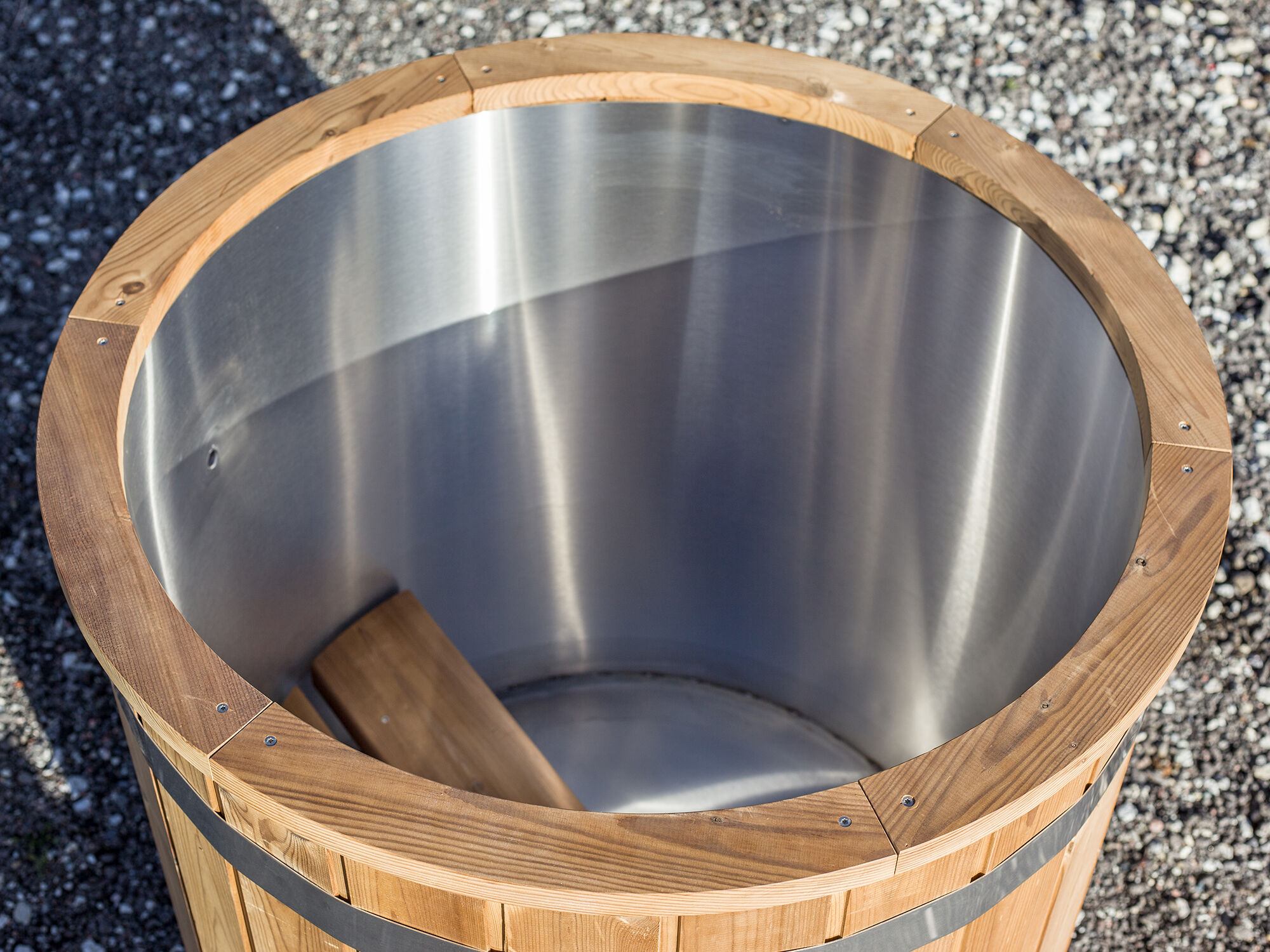 Bei der Thermoholzbehandlung wird das Holz unter Ausschluss von Sauerstoff auf Temperaturen zwischen 180 und 230° Celsius erhitzt.Die Fähigkeit des Holzes, Wasser aufzunehmen, wird dadurch stark reduziert und holzabbauende Pilze und Bakterien verlieren somit ihre Nahrungsgrundlage.Das erhöht die Haltbarkeit des Holzes. Alle Holzteile des Tauchbeckens (außer Standfüße) werden aus nordischen Thermoholz geliefert.