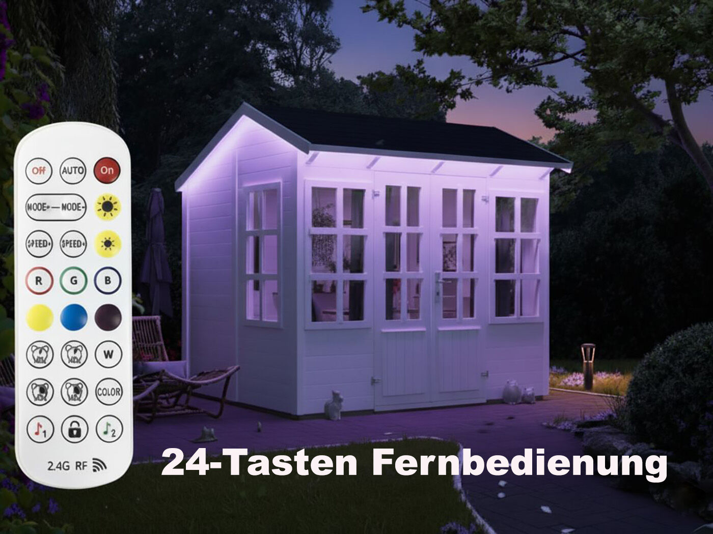 Verwandeln Sie Ihr Gartenhaus in einen echten Hingucker mit dem Gartenhaus LED Kit. Der 10 Meter lange, wasserdichte LED-Leuchtstreifen (IP68) ist speziell für den Einsatz im Innen- und Außenbereich konzipiert – ideal für Garten- und Gerätehäuser, Holzgaragen oder Gartensaunen.