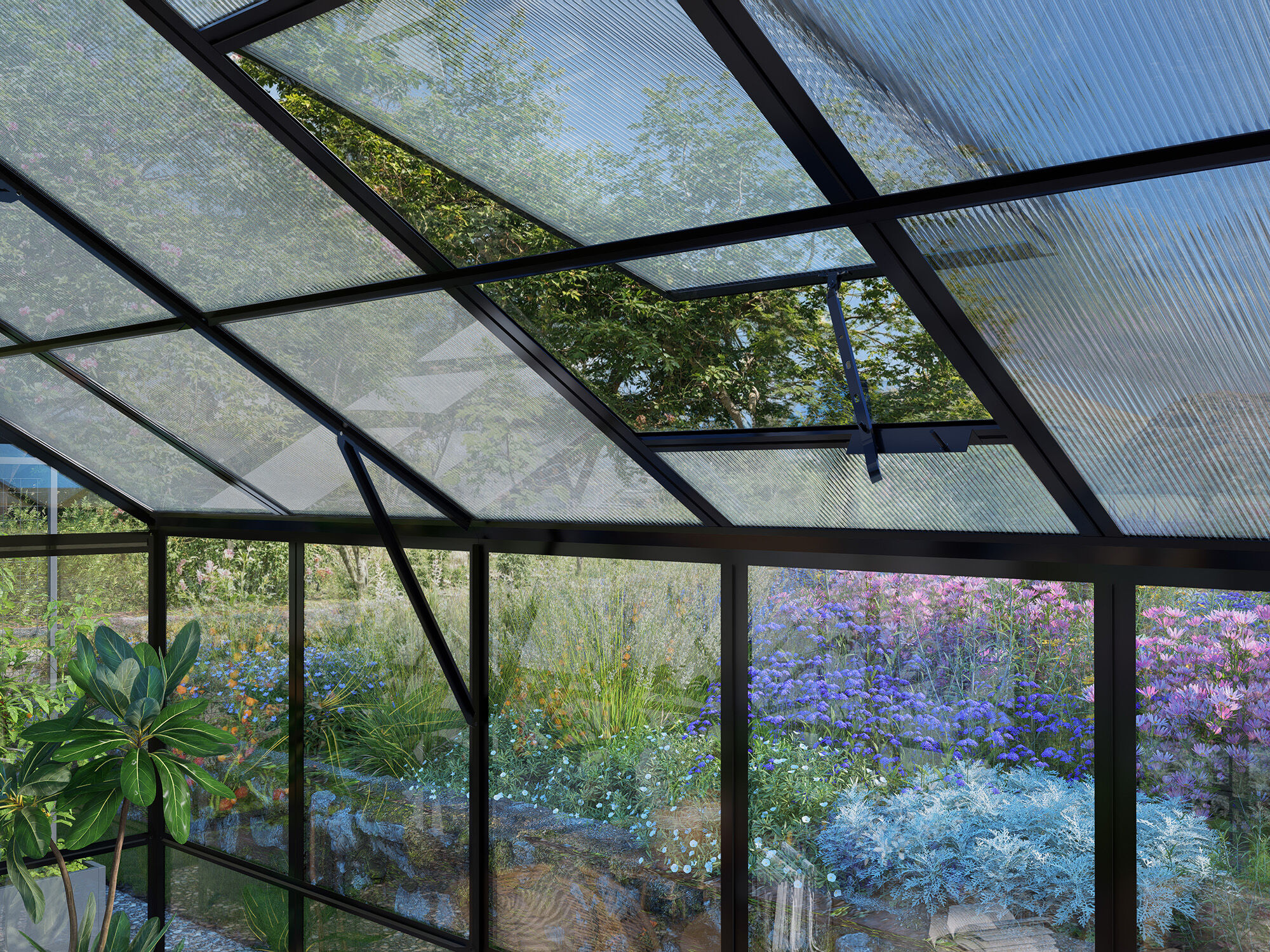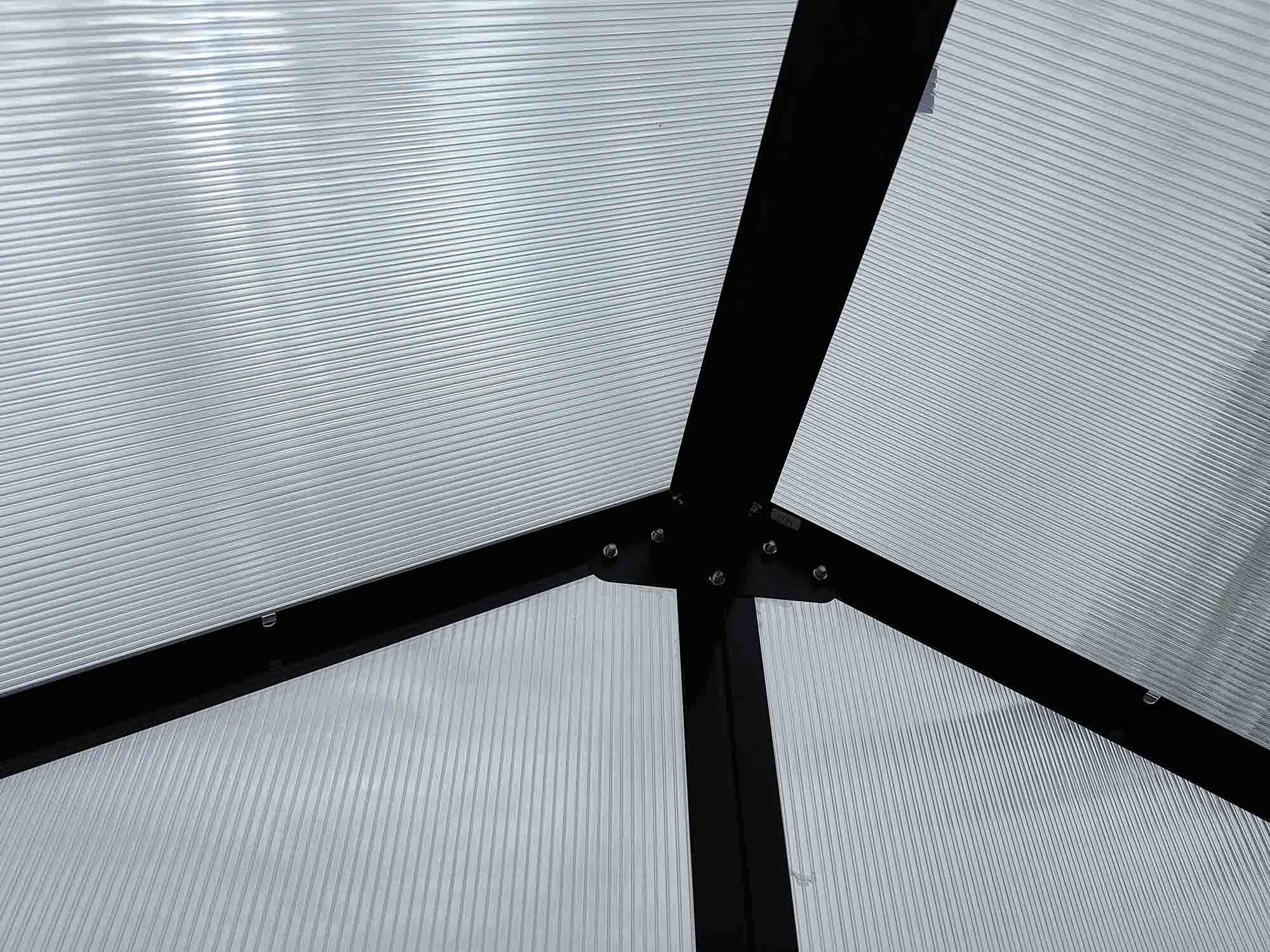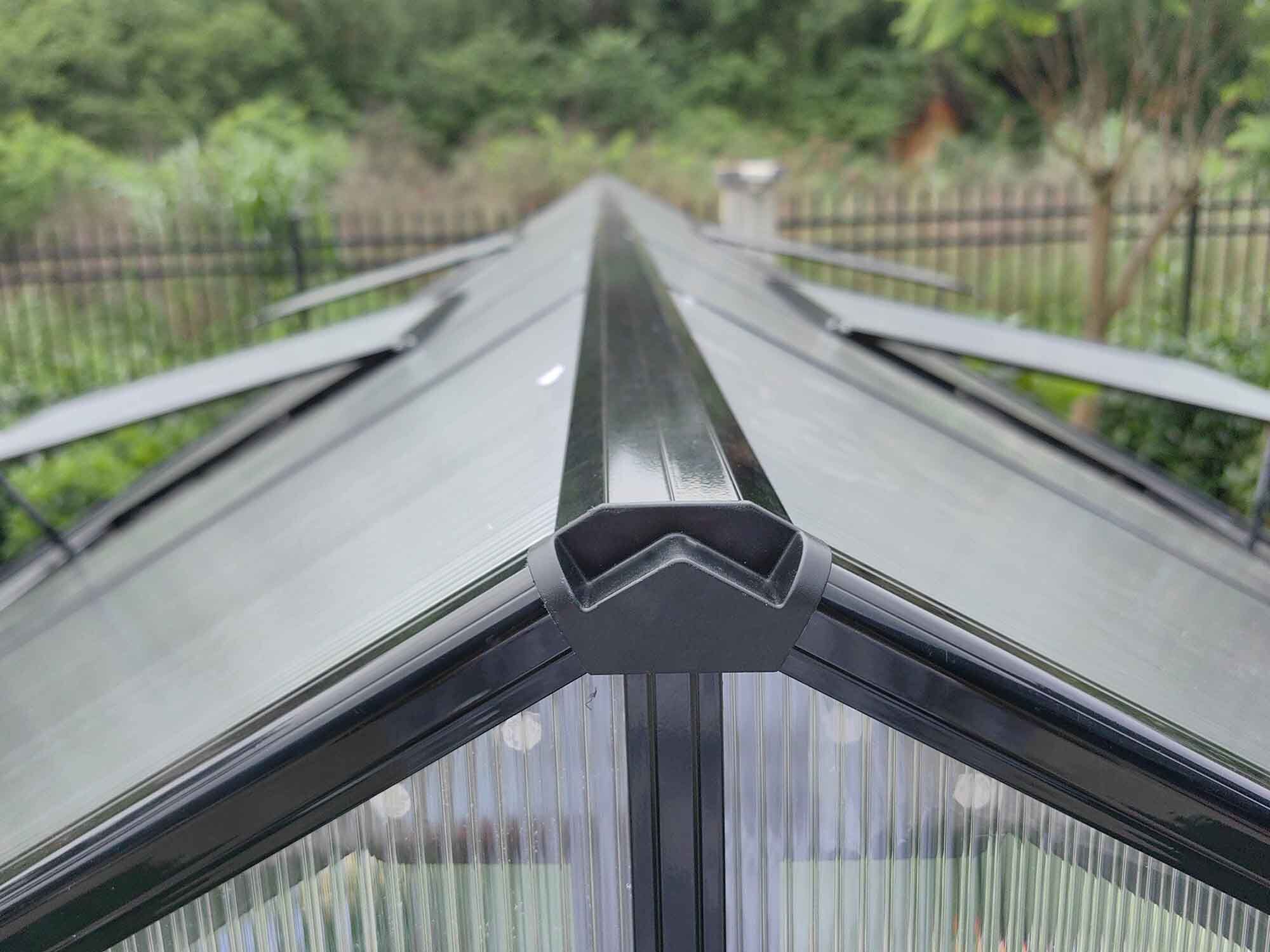 Das Gestell besteht aus korrosionsbeständigen Aluminiumprofilen in schwarz pulverbeschichtet. Diese sind nicht nur besonders stabil, sondern auch komplett wartungsfrei und witterungsbeständig. Zum Lieferumfang gehören außerdem Regenrinnen mit Fallrohren, die das Regenwasser gezielt ableiten – ideal zur Regenwassernutzung.