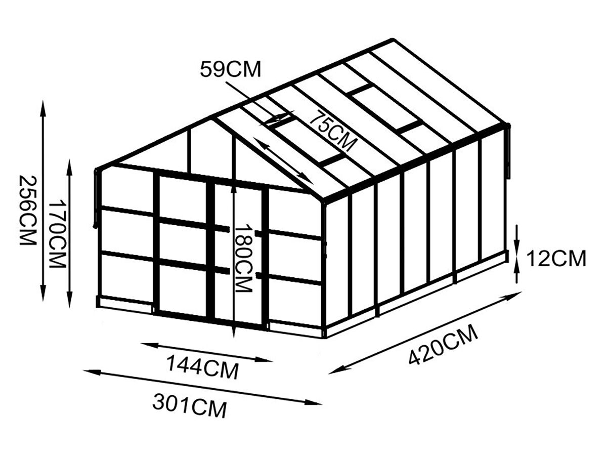 Mit einer Seiten- und Traufhöhe von 1,70 m genießen Sie beim Gärtnern eine angenehme Bewegungsfreiheit. Die große Doppeltür ermöglicht einen bequemen Zugang – auch mit Schubkarre oder Gießkanne. Für ein angenehmes Klima im Inneren sorgen vier integrierte Dachfenster mit Aufsteller, die eine effektive Belüftung sicherstellen. Für den ebenerdigen und rechtwinkligen Aufbau des Gewächshauses ist ein 12 cm hoher Fundamentrahmen aus farbbeschichtetem Stahlblech im Lieferumfang enthalten.