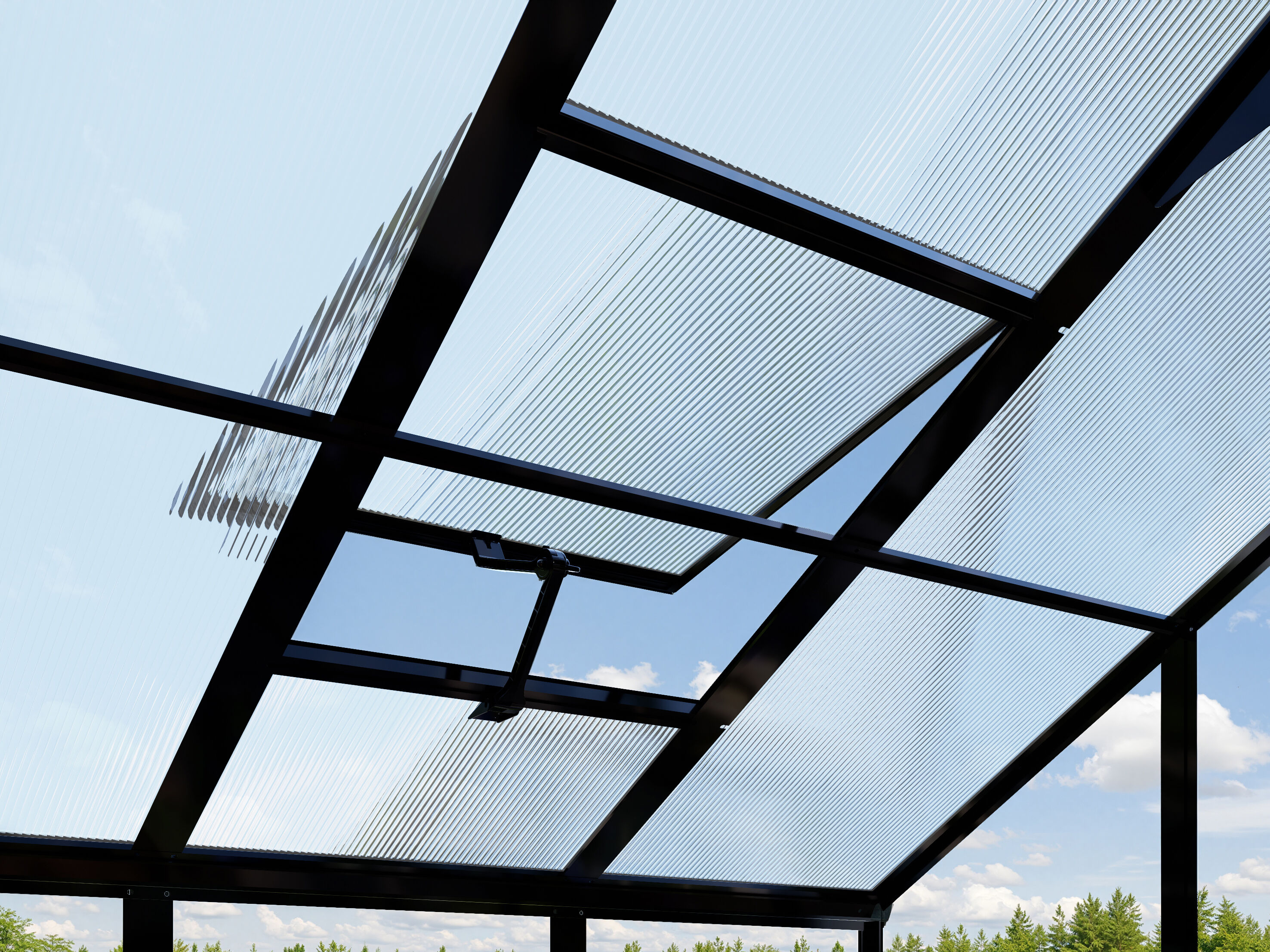 Das Gestell besteht aus korrosionsbeständigen Aluminiumprofilen in schwarz pulverbeschichtet. Diese sind nicht nur besonders stabil, sondern auch komplett wartungsfrei und witterungsbeständig. Zum Lieferumfang gehören außerdem Regenrinnen mit Fallrohren, die das Regenwasser gezielt ableiten – ideal zur Regenwassernutzung.