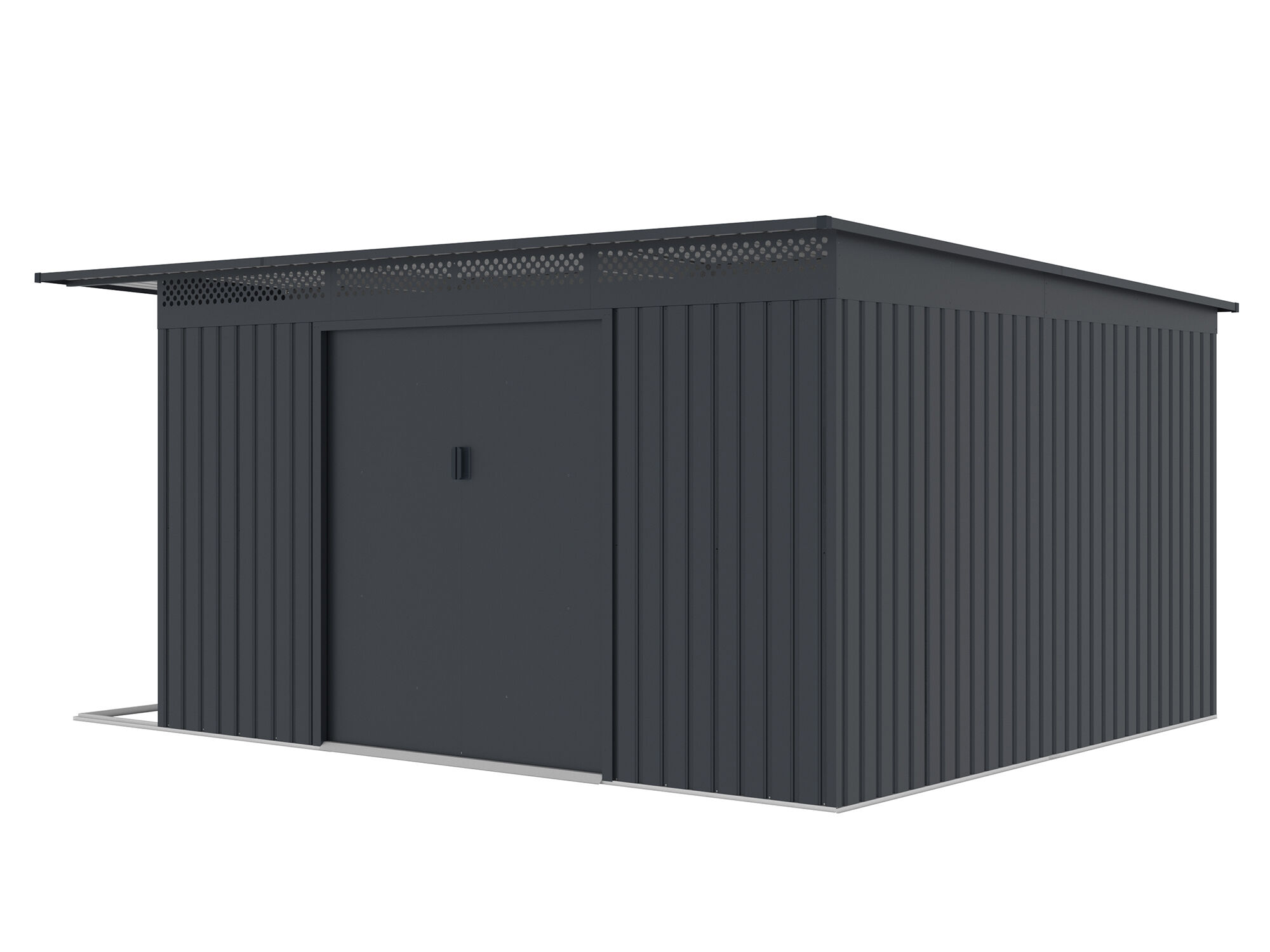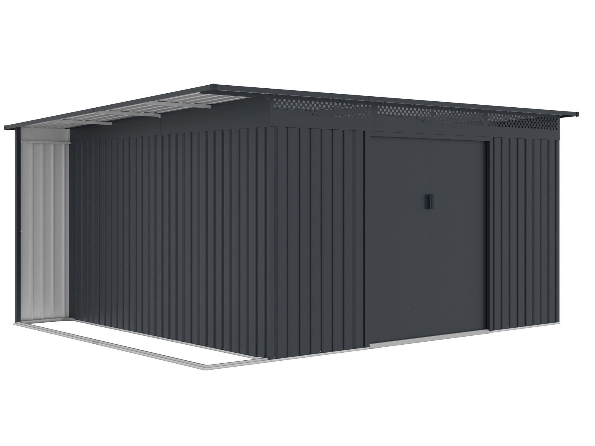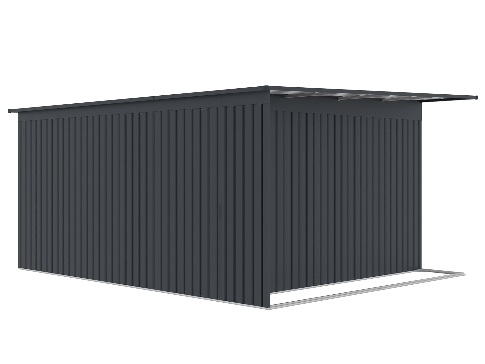 Das StarLine Metall Gerätehaus Modell Berlin bietet mit seiner Grundfläche von 10,23 m² und einer zusätzlichen überdachten Fläche von 1,70 m² eine stillvolle und langlebige Lagerlösung für Ihren Garten. Das moderne Pultdach verleiht dem Gartenhaus eine sehr moderne Optik. Das Gerätehaus der Marke StarLine Metall ist aus feuerverzinktem Stahlblech und einer besonders dicken kratzfesten Polyesterlackierung hergestellt, welches Ihnen Langlebigkeit und Wetterfestigkeit garantiert. Das Gerätehaus verfügt über eine innenliegende Schiebetür für einen leichten Zugang und ist mit geeigneten Türgriffen für ein Vorhängeschloss ausgestattet, mit dem Sie den Schuppen verschließen und sichern können. Das seitliche Schleppdach eignet sich perfekt für die Lagerung von Feuerholz oder als zusätzlichen Stellplatz für Ihre Gartenutensilien. Dieses elegante, wartungsfreie Gerätehaus ist nicht nur eine praktische Ergänzung für Ihren Außenbereich, sondern auch ein echter Hingucker in Ihrem Garten.