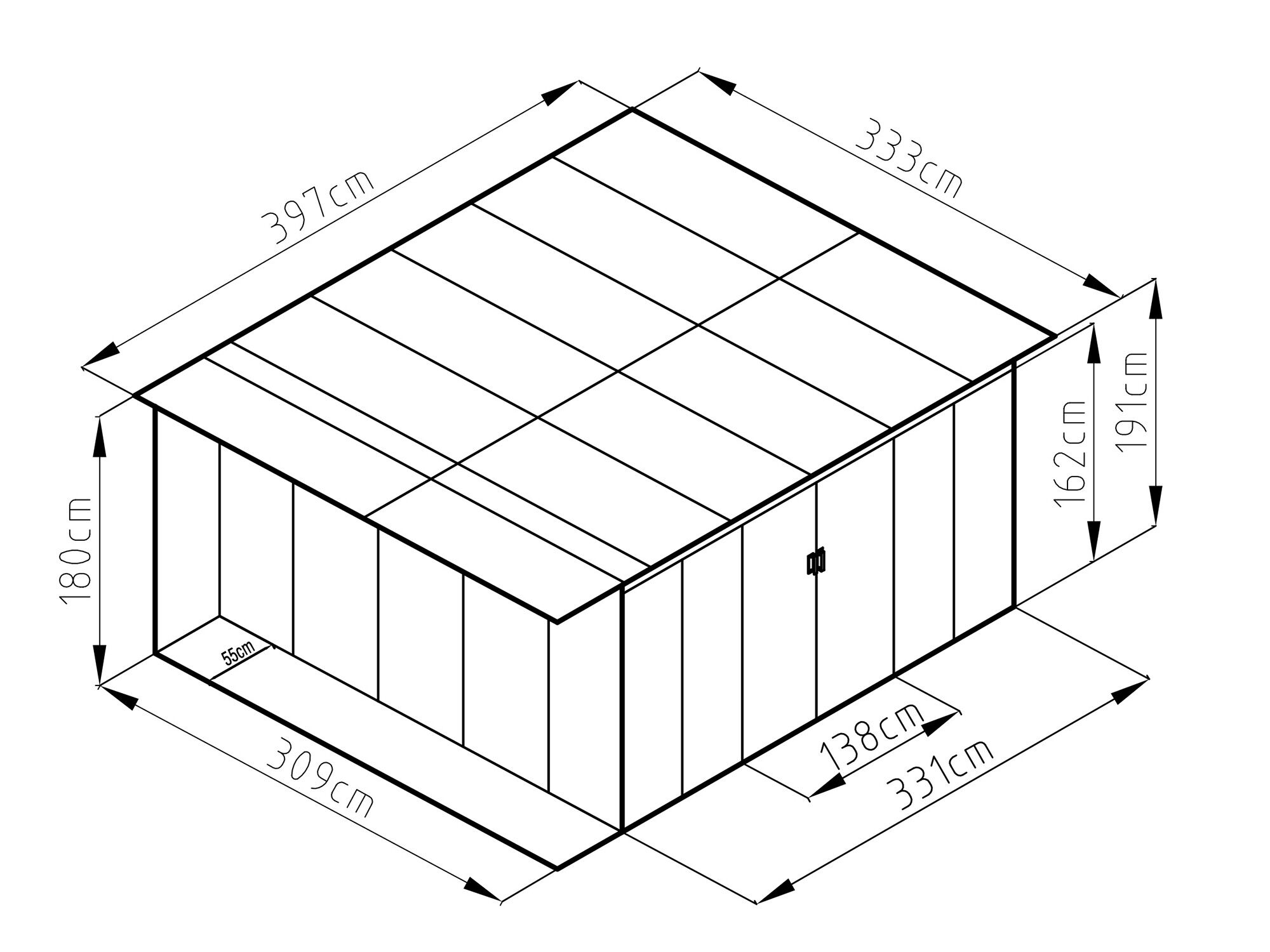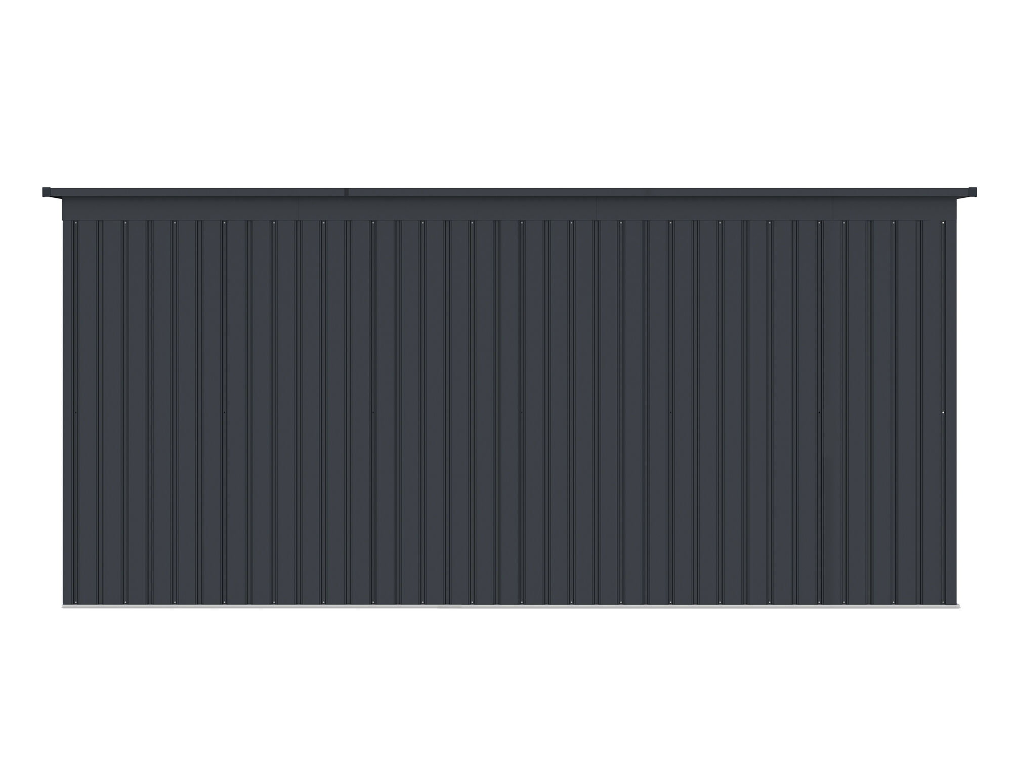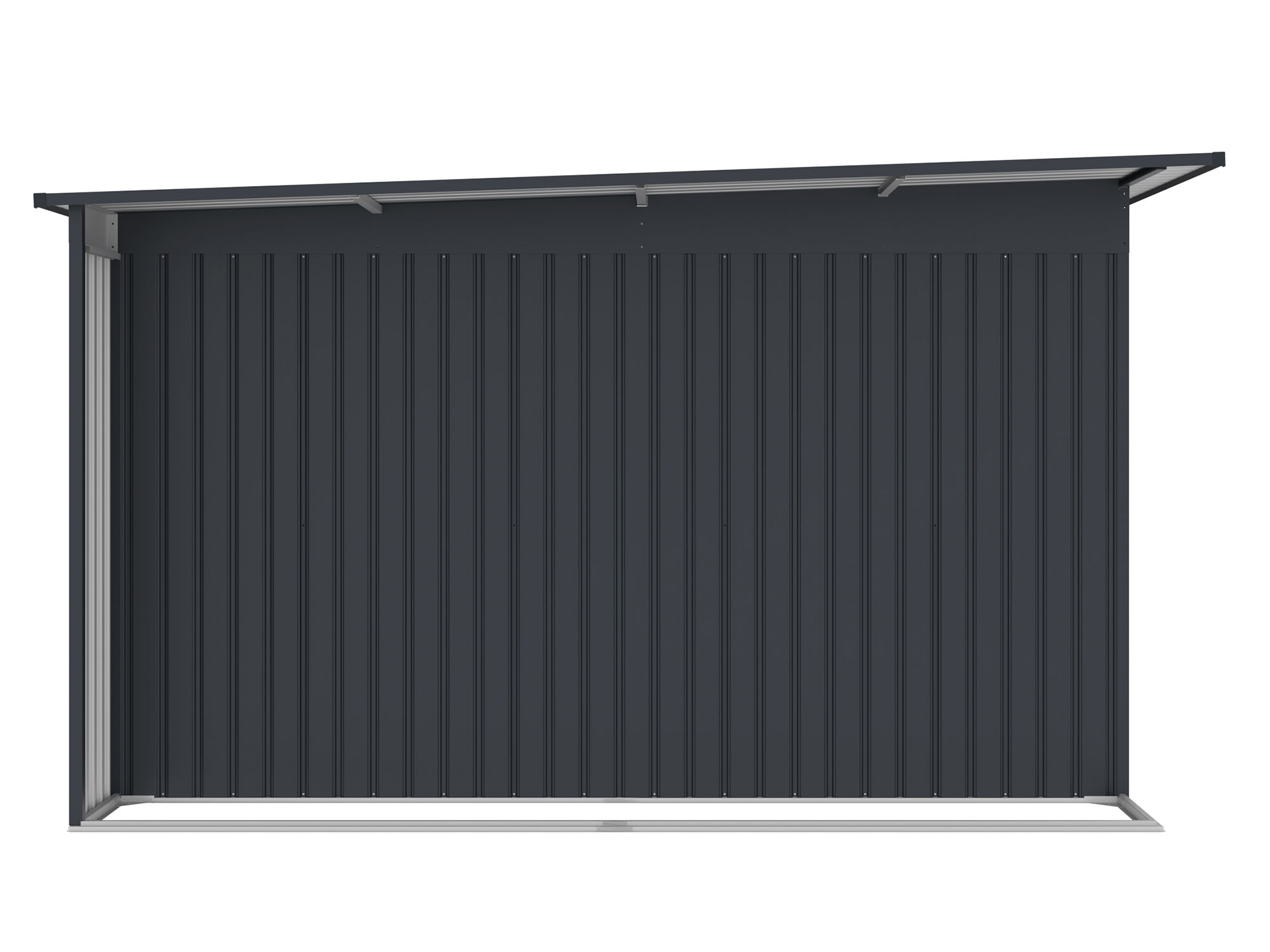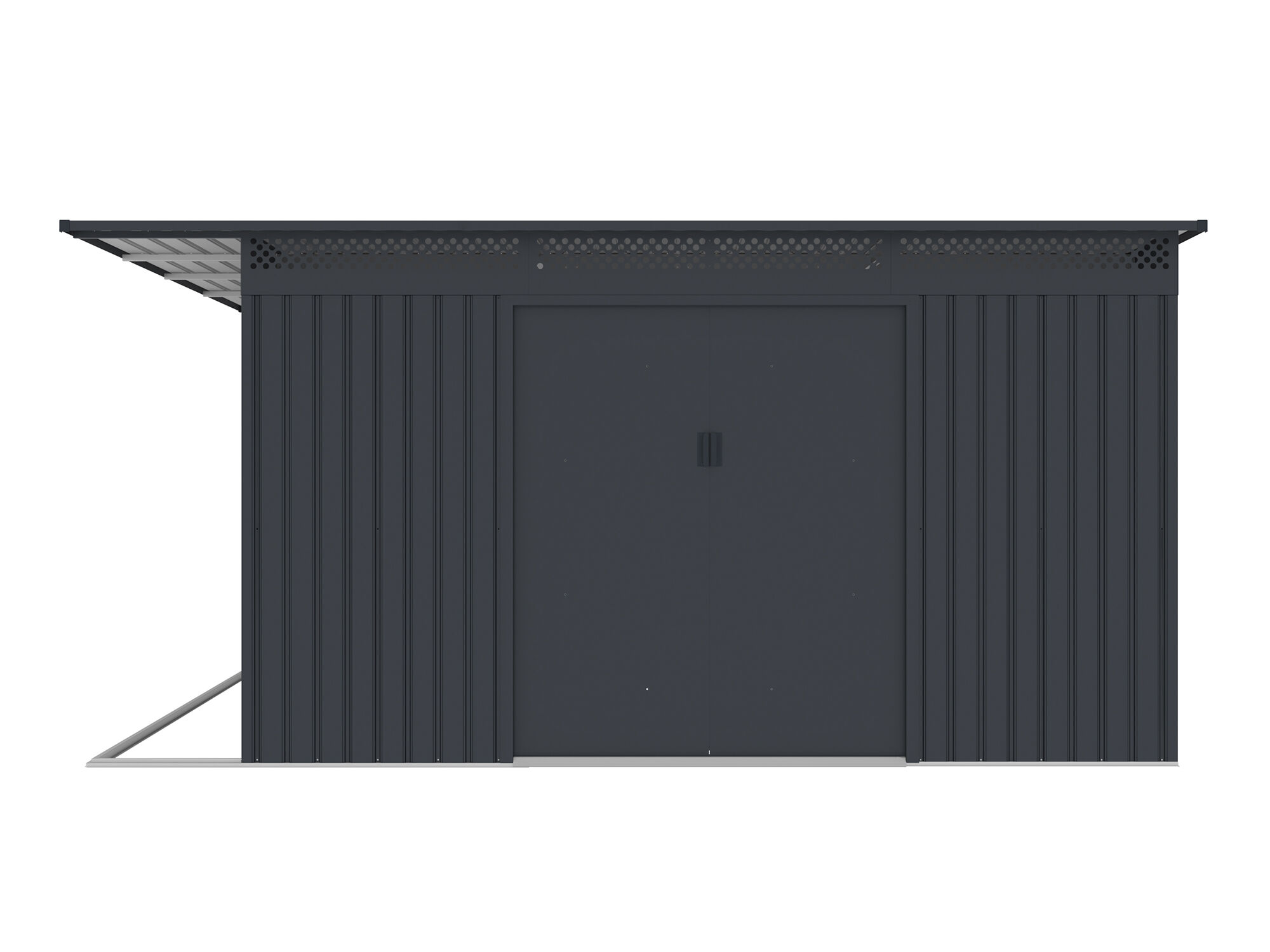 Das StarLine Metall Gerätehaus Modell Berlin bietet mit seiner Grundfläche von 10,23 m² und einer zusätzlichen überdachten Fläche von 1,70 m² eine stillvolle und langlebige Lagerlösung für Ihren Garten. Das moderne Pultdach verleiht dem Gartenhaus eine sehr moderne Optik. Das Gerätehaus der Marke StarLine Metall ist aus feuerverzinktem Stahlblech und einer besonders dicken kratzfesten Polyesterlackierung hergestellt, welches Ihnen Langlebigkeit und Wetterfestigkeit garantiert. Das Gerätehaus verfügt über eine innenliegende Schiebetür für einen leichten Zugang und ist mit geeigneten Türgriffen für ein Vorhängeschloss ausgestattet, mit dem Sie den Schuppen verschließen und sichern können. Das seitliche Schleppdach eignet sich perfekt für die Lagerung von Feuerholz oder als zusätzlichen Stellplatz für Ihre Gartenutensilien. Dieses elegante, wartungsfreie Gerätehaus ist nicht nur eine praktische Ergänzung für Ihren Außenbereich, sondern auch ein echter Hingucker in Ihrem Garten.