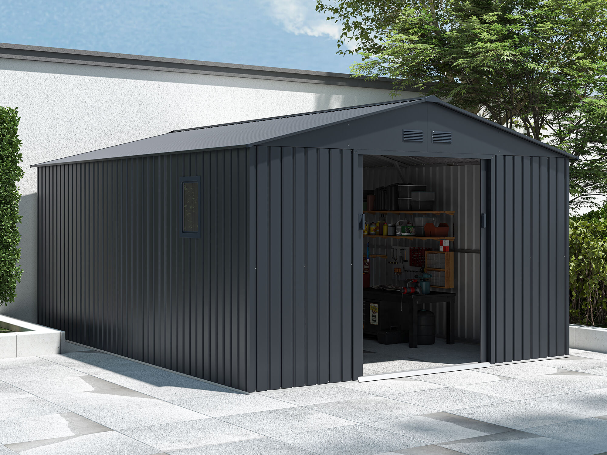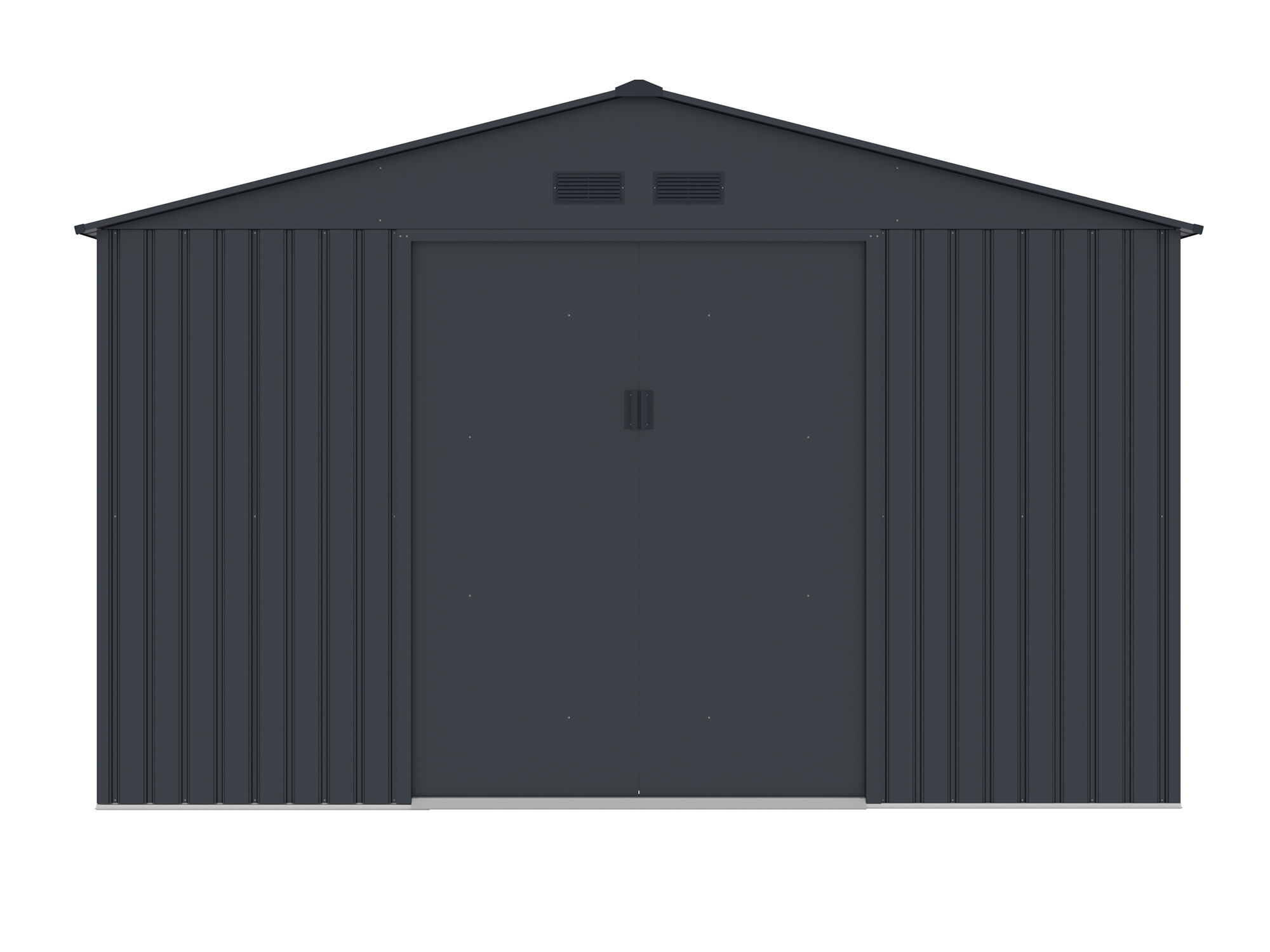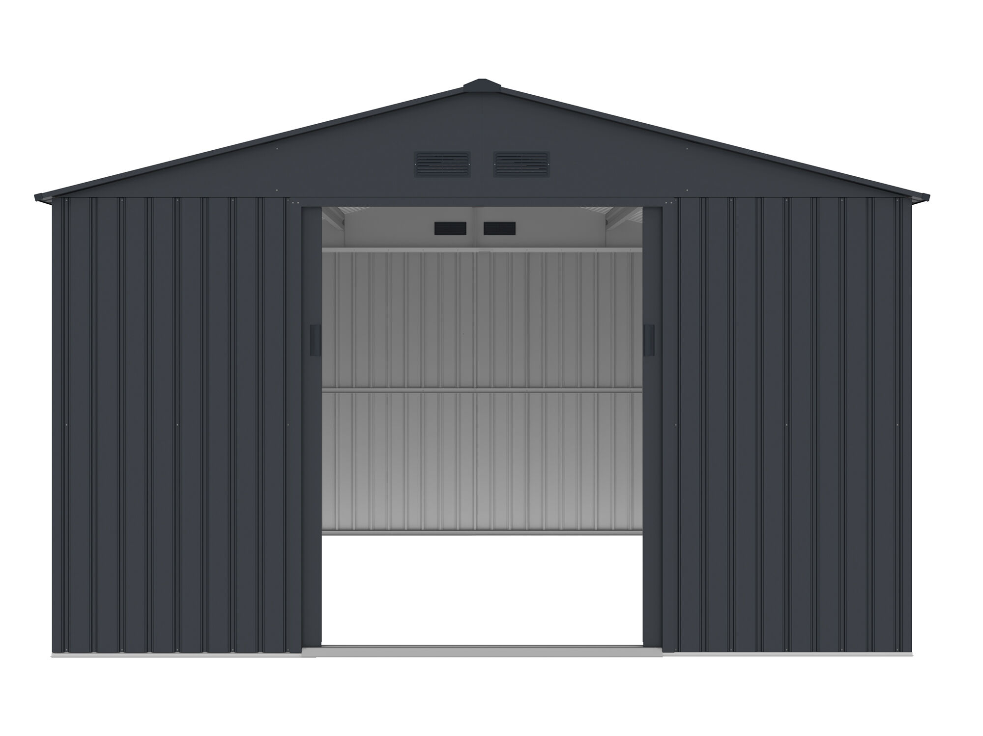 Sicherer & moderner Stauraum : Die Metall Gerätehaus Serie München ist mit einer leichtgängigen innenliegenden Doppelschiebetür ausgestattet, welche Ihnen einen einfachen Zutritt in das Innere des Gerätehauses ermöglicht. Die Griffe der Schiebetür haben eine Öffnung für ein Vorhängeschlos, mit dem Sie den Geräteschuppen verschließen können. Die moderne Pultdachbauweise und anthtrazitfarbene Lackierung verleihen dem Gerätehaus eine besonders moderne Optik.