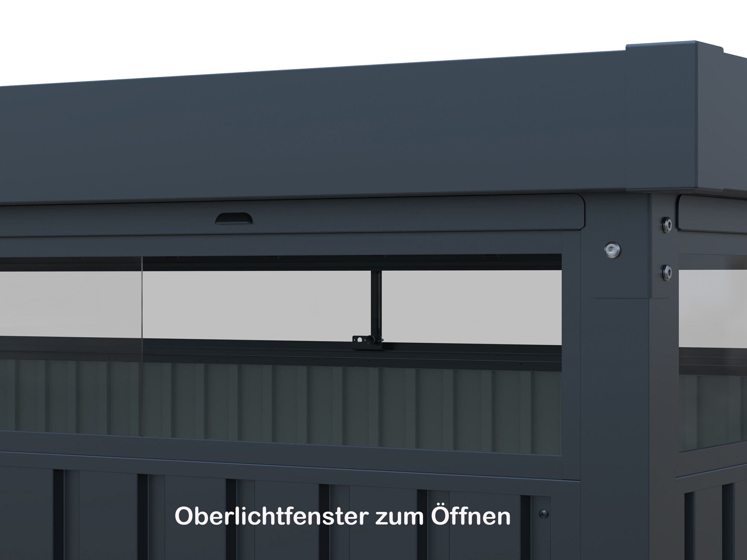 Funktional & Modern : Die Metall Gerätehaus Serie Skylight verfügt über ein großes Oberlichtfenster , welches eine Menge natürliches Tageslicht in das Innere des Gartenhauses bringt. Durch das praktische Oberlichtfenster verliert man im Inneren des Gartenhauses keine Stellfläche und hat eine Menge Platz für Gartenutensilien. Gleichzeitig verleiht das Oberlichtfenster dem gesamten Gartenhaus ein modernes und extravagantes Erscheinungsbild.