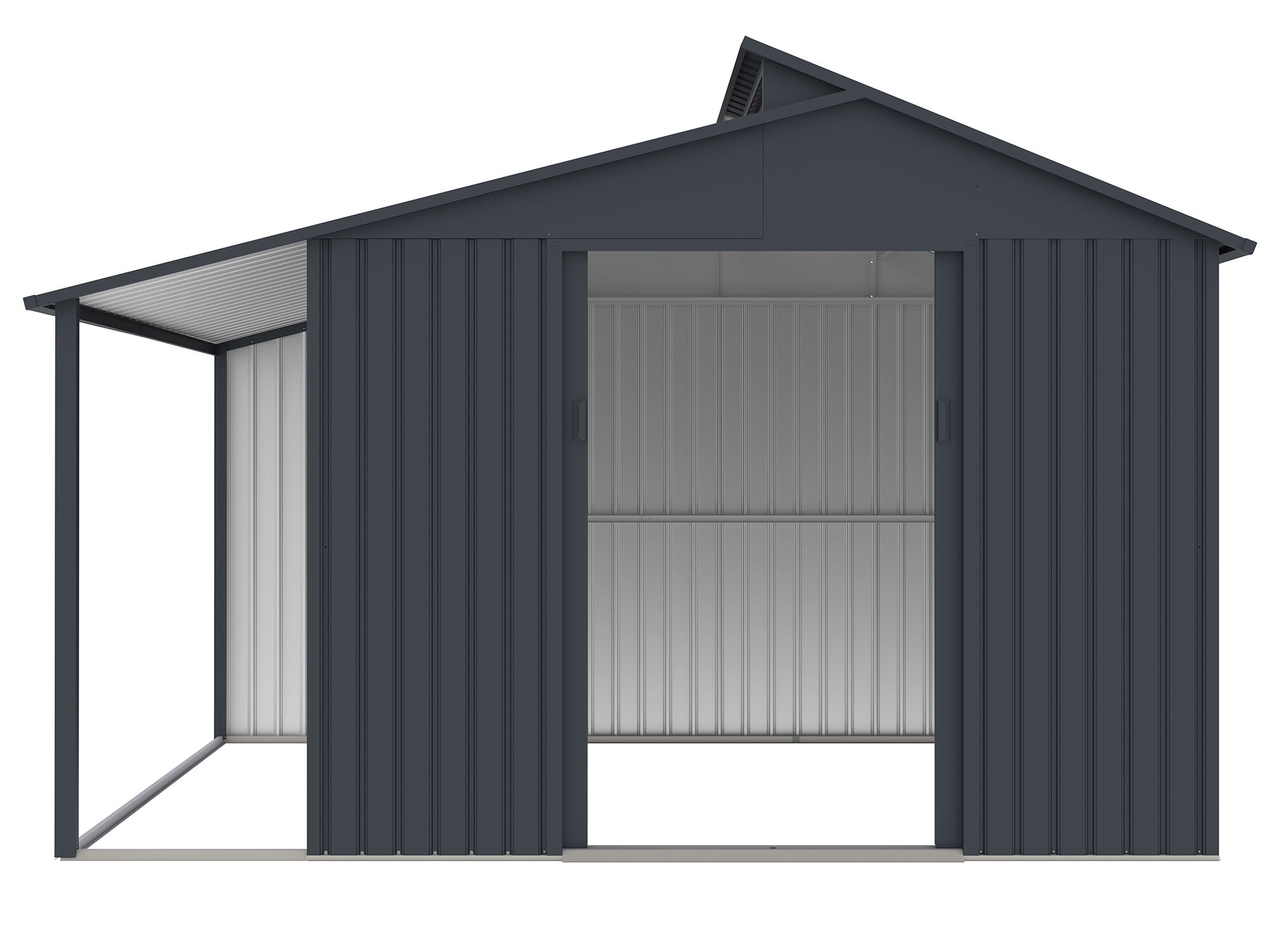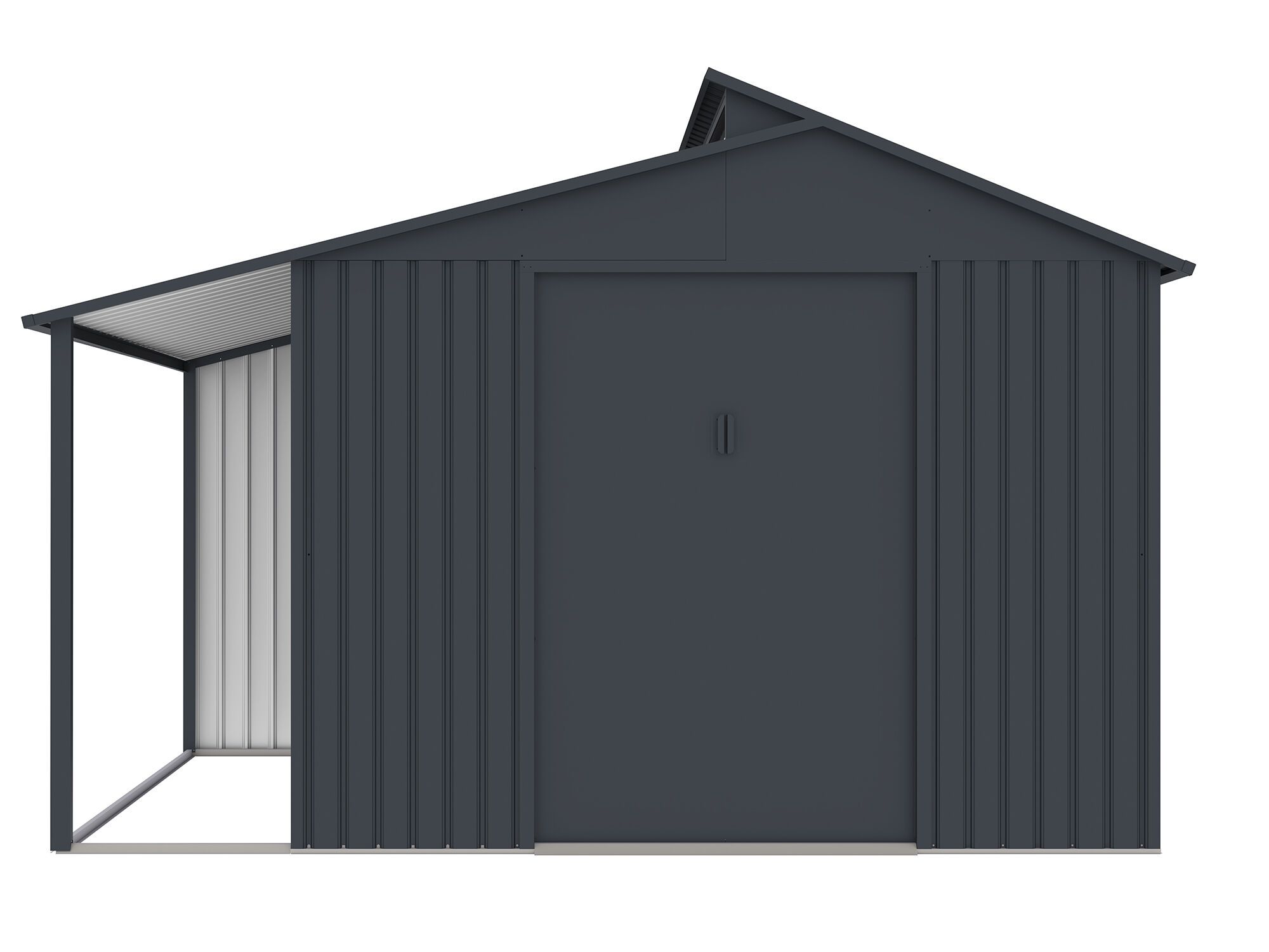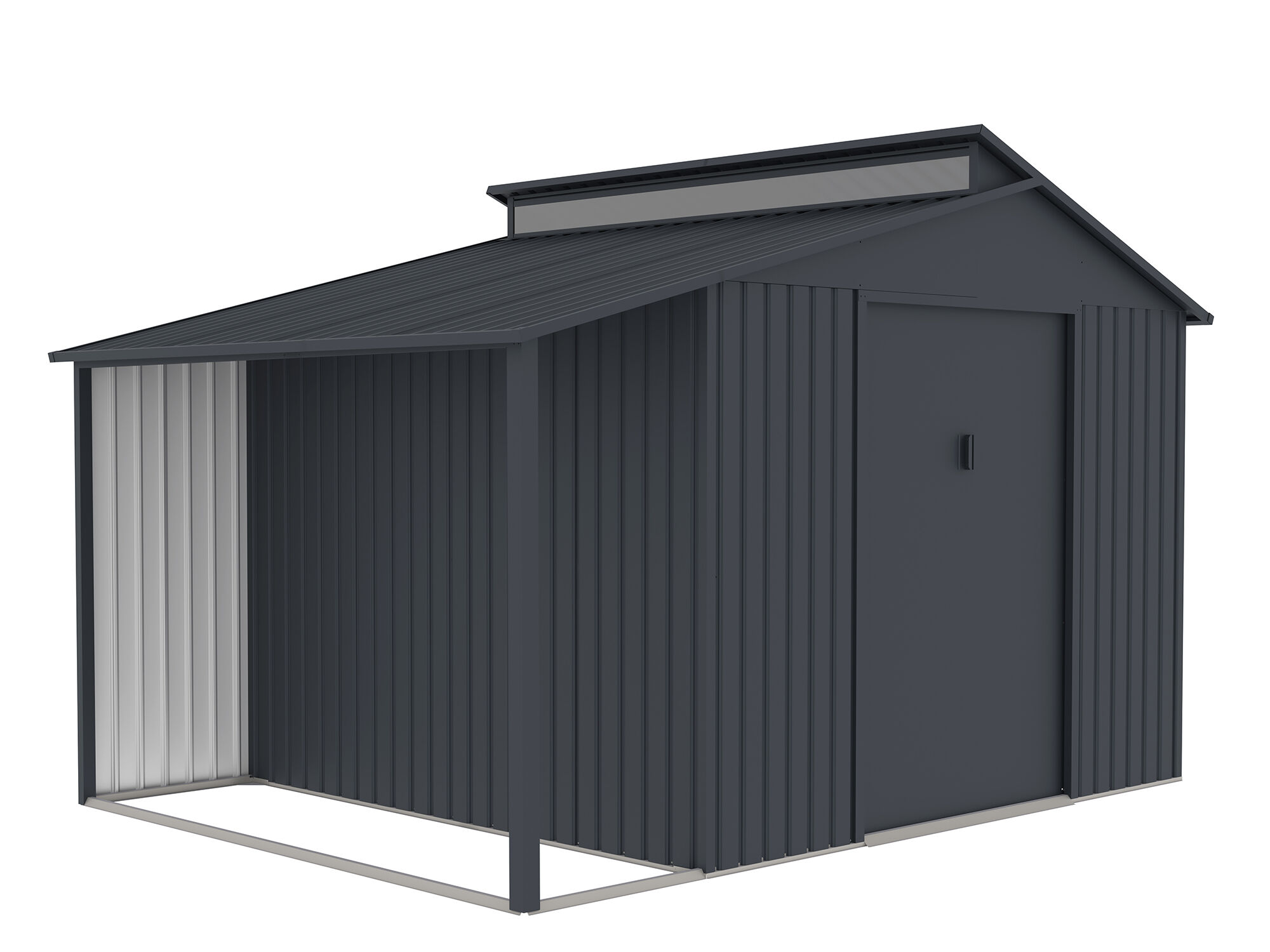 Das StarLine Metall Gerätehaus Modell Viva Varianta bietet mit seiner Grundfläche von 9,12 m² eine stillvolle und langlebige Lagerlösung für Ihren Garten. Das moderne versetzte Pultdach inkl. Lichtband verleiht dem Gartenhaus eine sehr moderne Optik. Das Gerätehaus der Marke StarLine Metall ist aus feuerverzinktem Stahlblech und einer besonders dicken kratzfesten Pulverbeschichtung hergestellt, welches Ihnen Langlebigkeit und Wetterfestigkeit garantiert. Das Gerätehaus verfügt über eine Schiebetür für einen leichten Zugang und ist mit geeigneten Türgriffen für ein Vorhängeschloss ausgestattet, mit dem Sie den Schuppen verschließen und sichern können. Das seitliche überdachte Schleppdach bietet zusätzlichen Stauraum für z.B. Feuerholz oder andere Gartenutensilien. Dieses elegante, wartungsfreie Gerätehaus ist nicht nur eine praktische Ergänzung für Ihren Außenbereich, sondern auch ein echter Hingucker in Ihrem Garten.