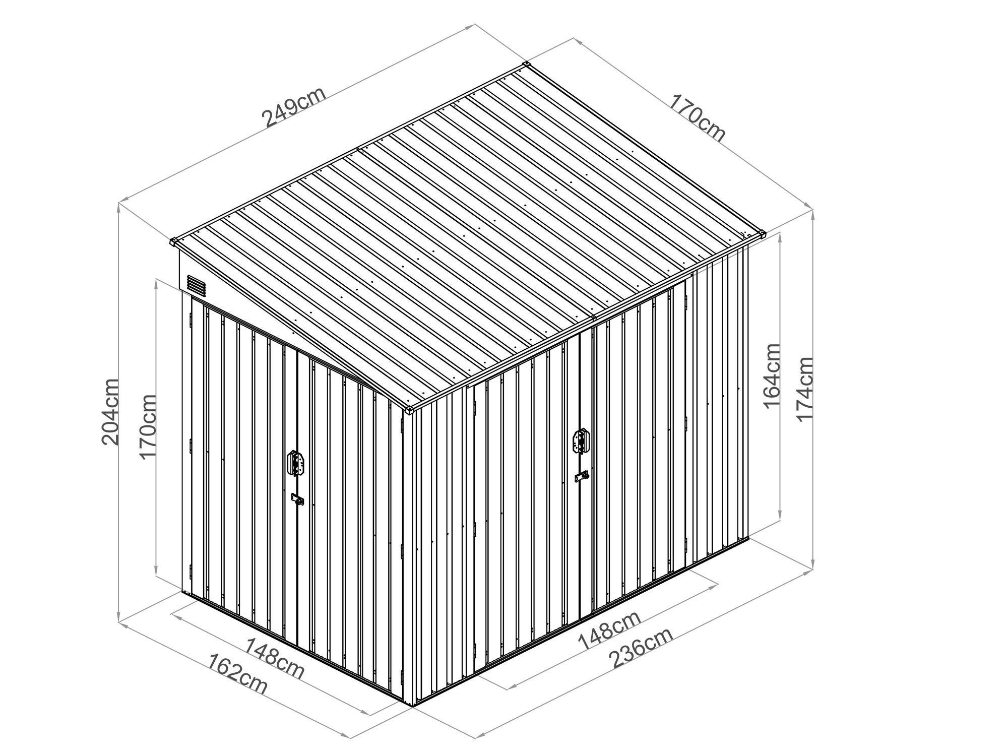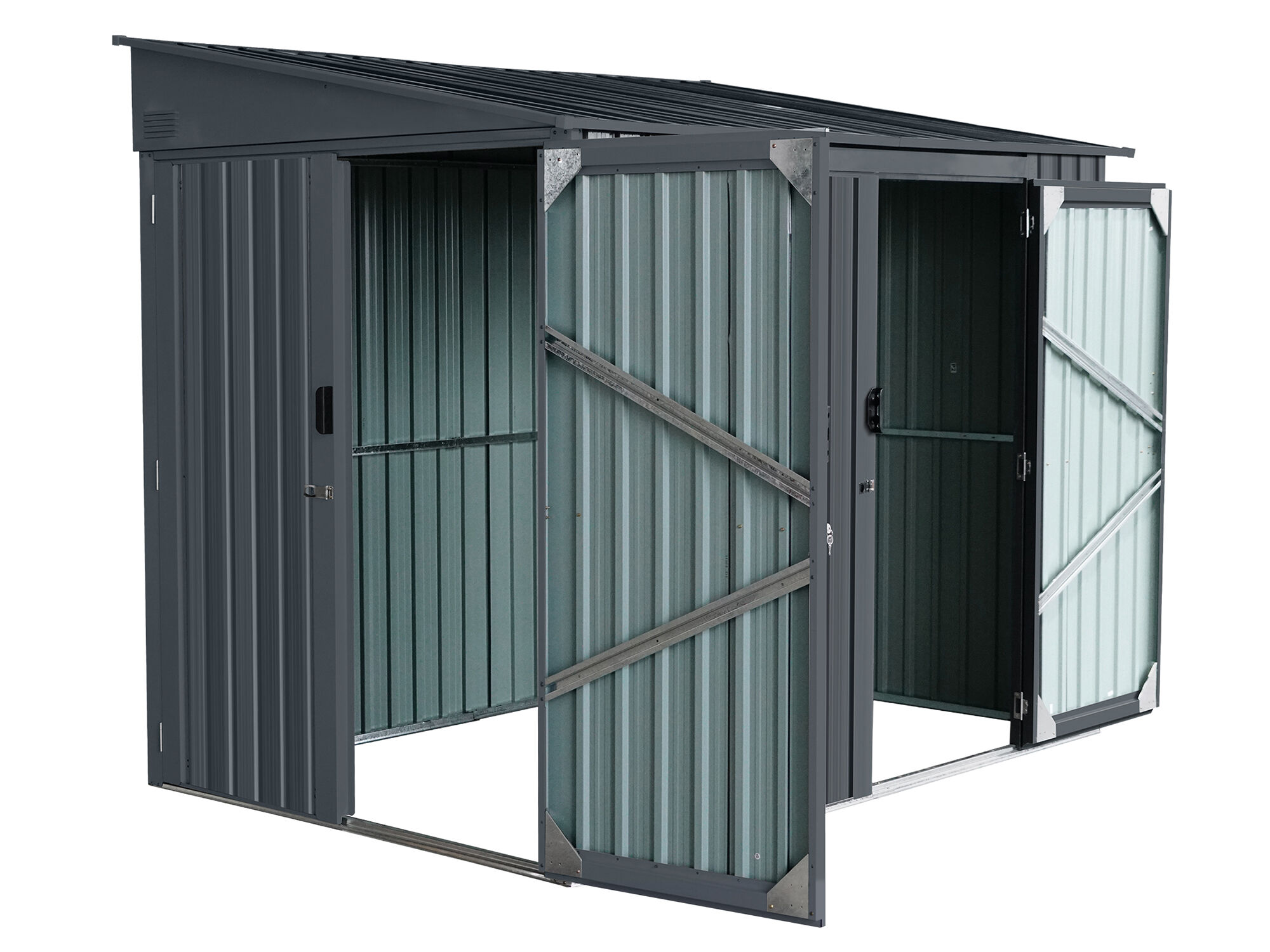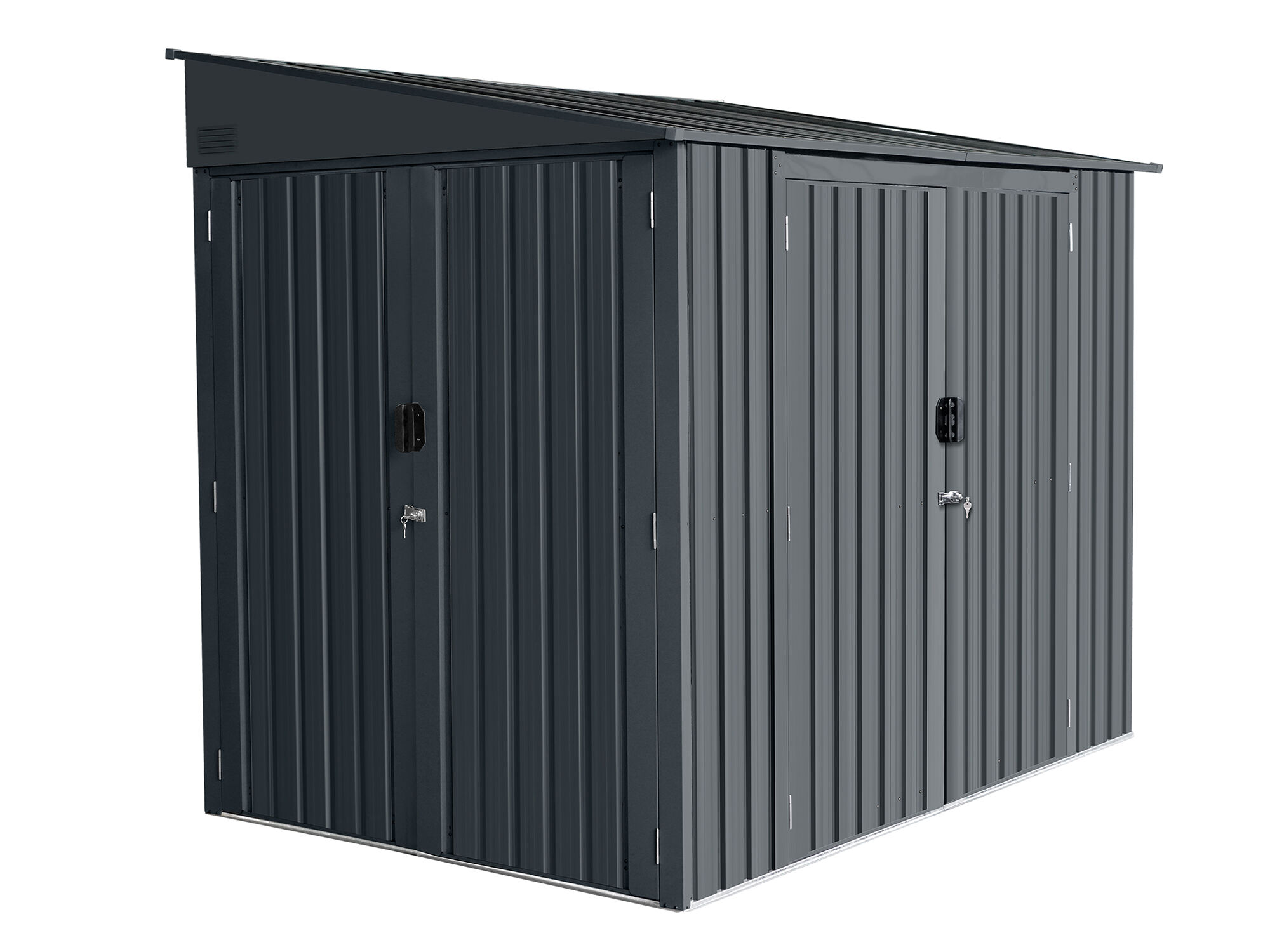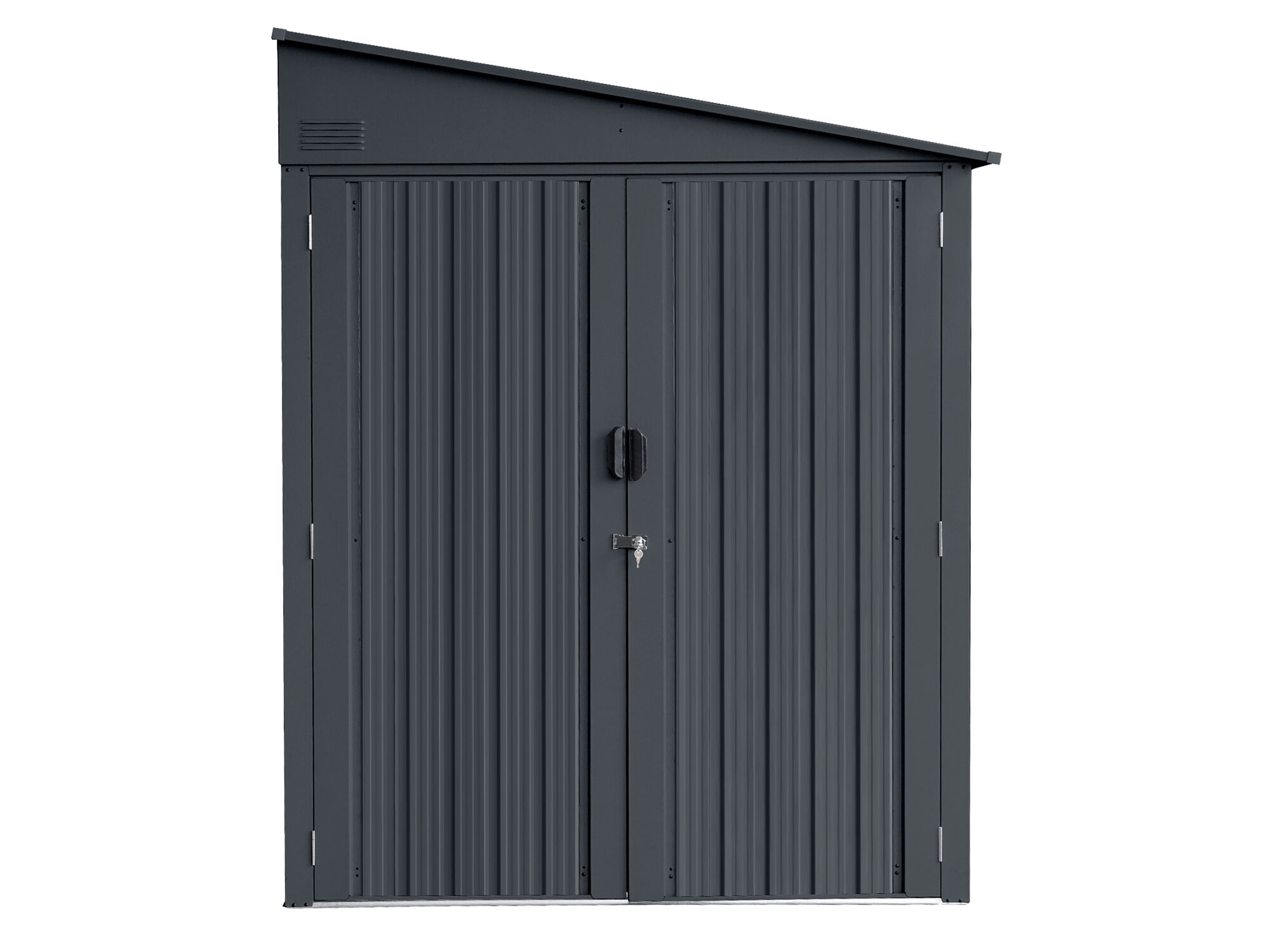 Das moderne Metallgerätehaus Modell Slope mit Pultdach, ist flexibel einsetzbar auch als Anbauhaus an die Wand. Die besondere Ausstattung sind zwei große Doppeltüren : eine Tür an der Stirnseite und eine Tür an der Frontseite, beide lassen sich weit öffnen. Dieses Metallgerätehaus eignet sich ideal als Fahrradgarage, Motoradschuppen oder ganz einfach als Geräteschuppen für Rasenmäher und Co. Die Türen können mit einem Vorhängeschloss (nicht im Lieferumfang enthalten) verriegelt werden. Langlebige Konstruktion : Gefertigt aus verzinktem Stahl, kombiniert das Gerätehaus Stabilität mit hervorragendem Schutz vor Witterungseinflüssen. Die Vierfach-Lackierung in Anthrazitgrau verleiht dem Produkt nicht nur eine moderne Optik, sondern sorgt auch für zusätzlichen Schutz gegen Korrosion und Abnutzung.