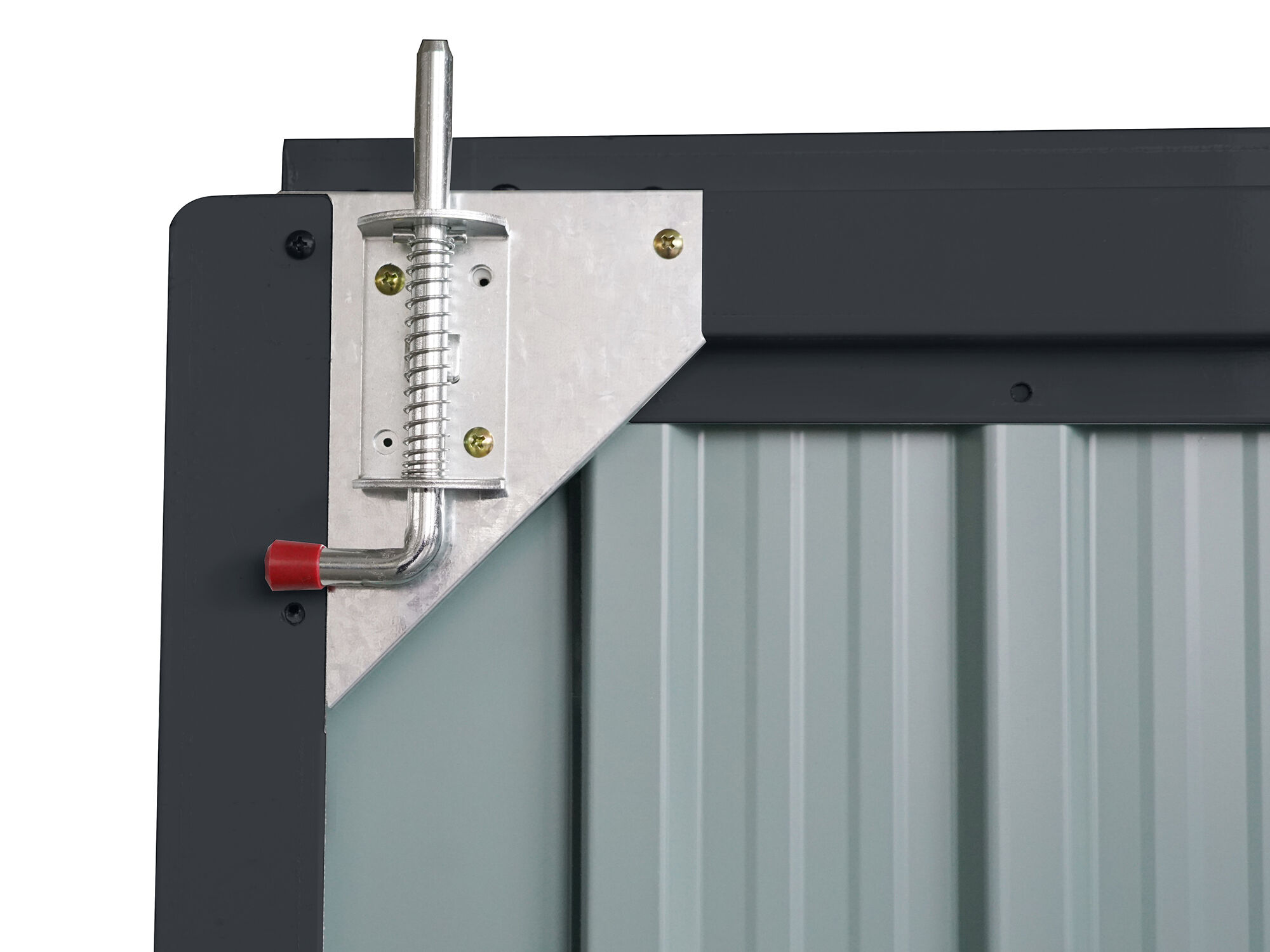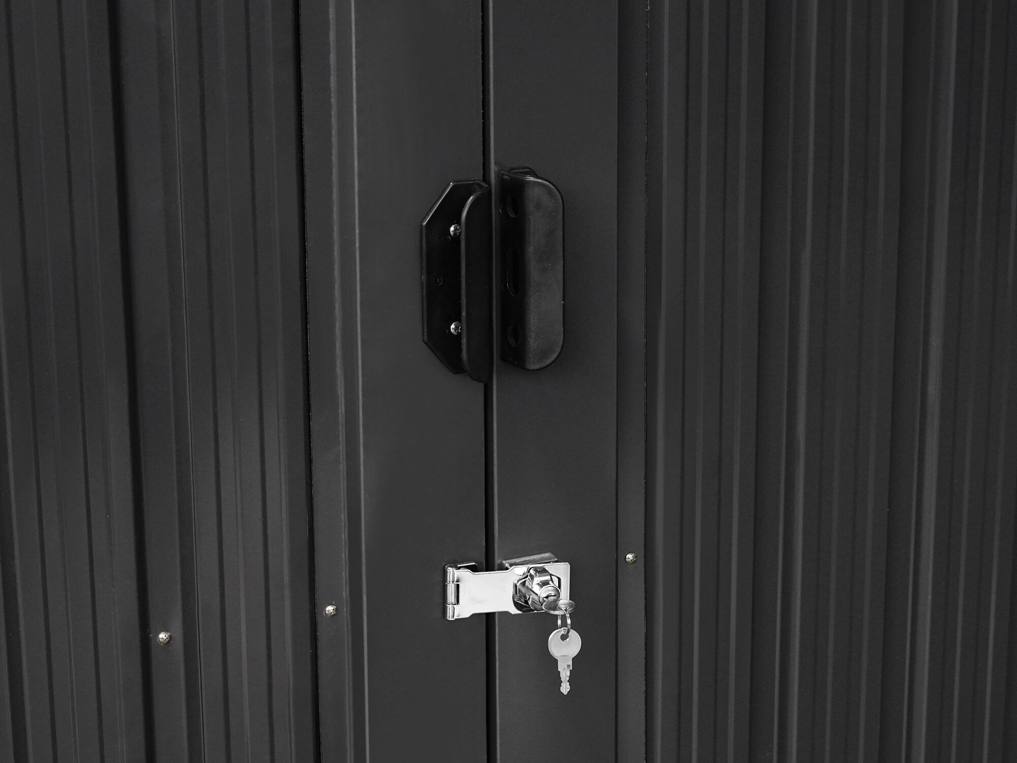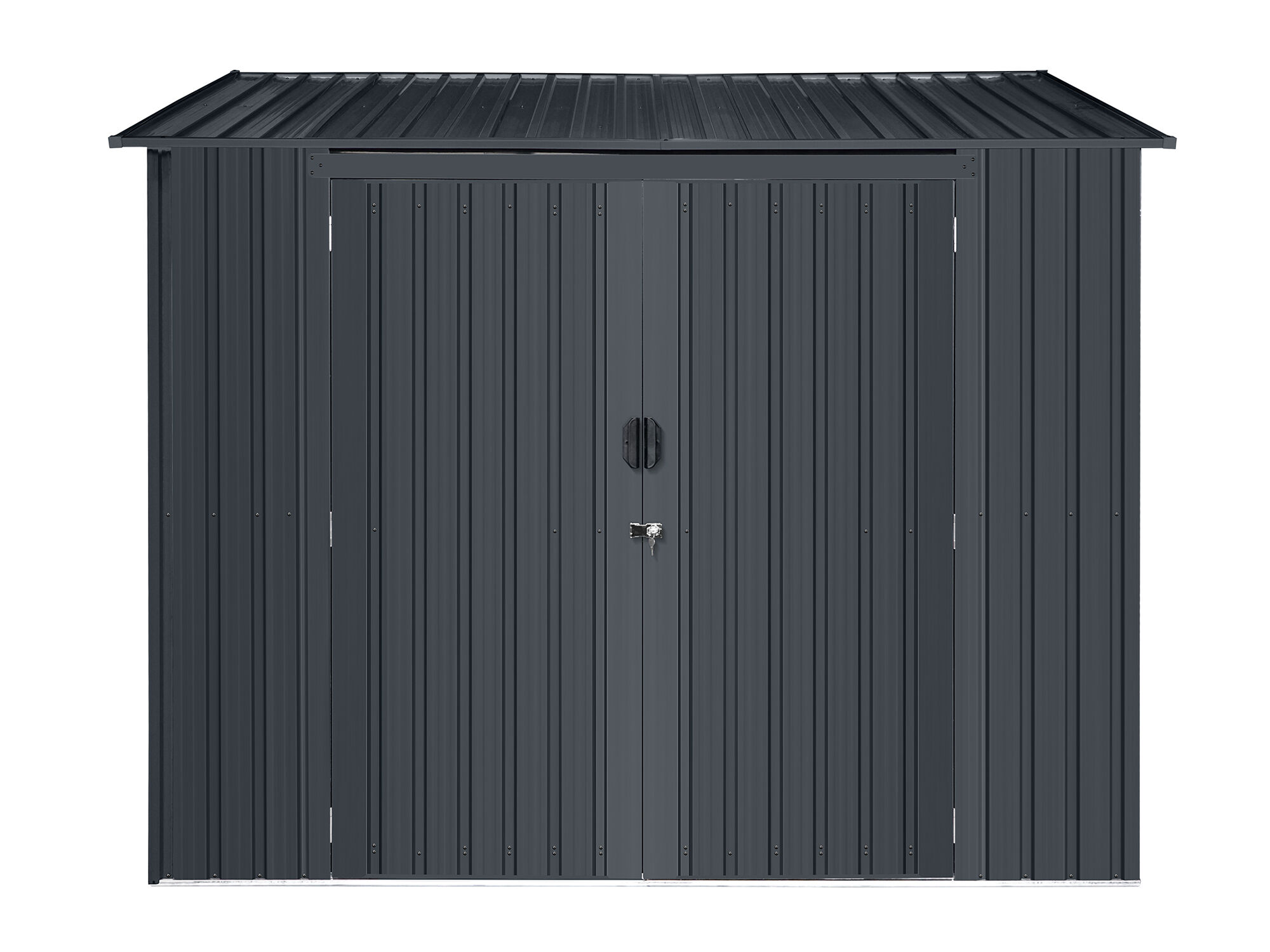 Sicherer & moderner Stauraum : Die Metall Gerätehaus Serie Pento ist mit einer leichtgängigen Doppelschiebetür ausgestattet, welche Ihnen einen einfachen Zutritt in das Innere des Gerätehauses ermöglicht. Die Griffe der Schiebetür haben eine Öffnung für ein Vorhängeschlos, mit dem Sie den Geräteschuppen verschließen können. Die moderne Pultdachbauweise und anthtrazitfarbene Lackierung verleihen dem Gerätehaus eine besonders moderne Optik.